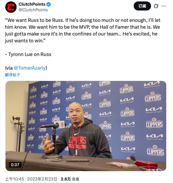 “快船主教练泰伦·卢在2023年说:我们希望威少做自己;掘金前主教练马龙在2024年说:我依然希望威少做自己;国王主教练克里斯蒂在2025年说:我只希望威少做自己!我们好像陷入了循环!”